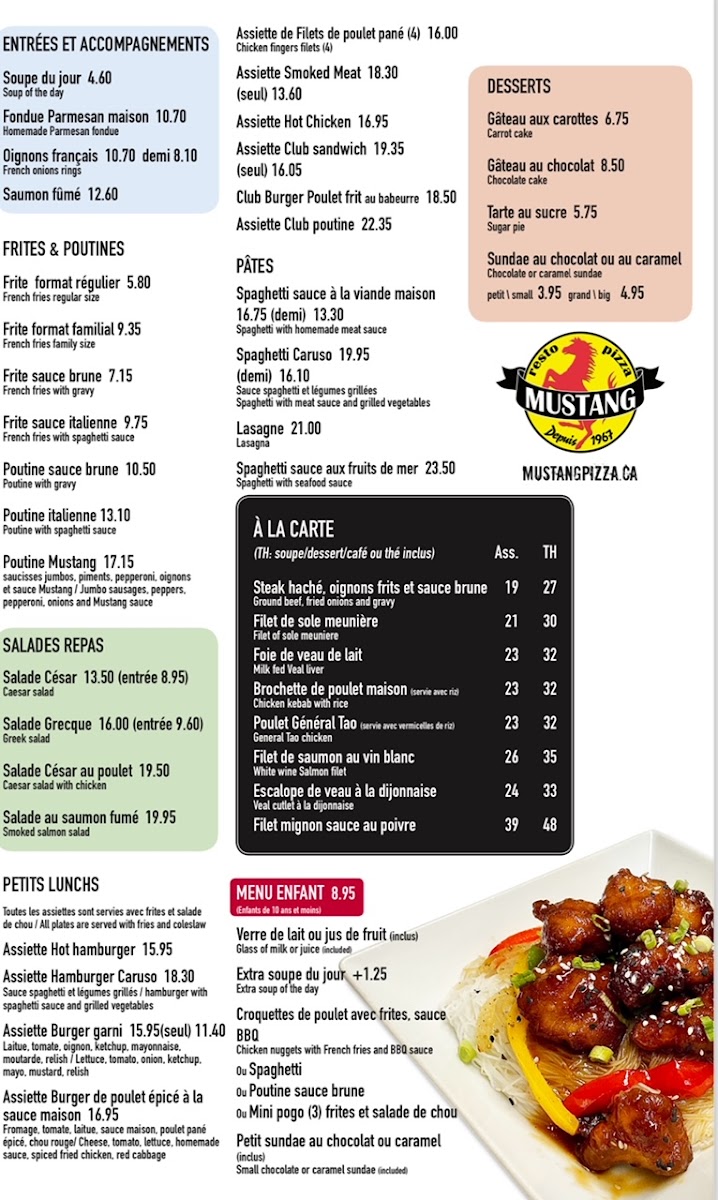 Welcome to Restaurant Mustang, located at 660 Route Des Rivières Saint-Nicolas, Qc G7a 2t6 Canada. This hidden gem offers a diverse menu that will tantalize your taste buds. From their delicious pizzas to their mouth-watering fries, poutines, and onion rings, there is something for everyone to enjoy.